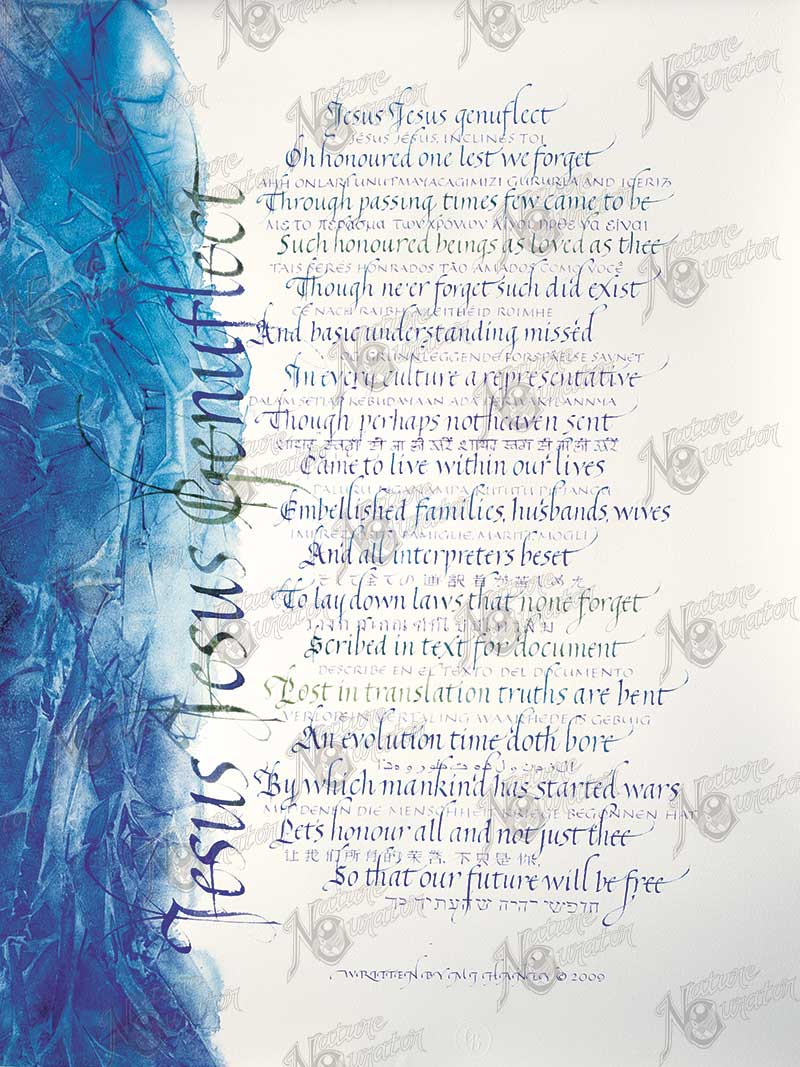 …is a rhyming piece of written calligraphic art by Gemma Black. Each of its 18 lines has a different language translation scribed between the English work, that seeks to offer a global representation on behalf of all religious and language origins. It is my declaration for desiring ubiquitous respect for all walks of life and their belief systems. A plea to live and let live if you will. The piece has been photographed with a camera that ensures no detail is lost no matter what size the image is enlarged to. In keeping with this, the concept is to one day project the artwork on a wall or silo that the public can view by day or night to see the detail of the words and feel the intent of the art. It seeks to open up a conversation among the community in hope to be the drop of water that sends waves of love that can be felt across the globe.